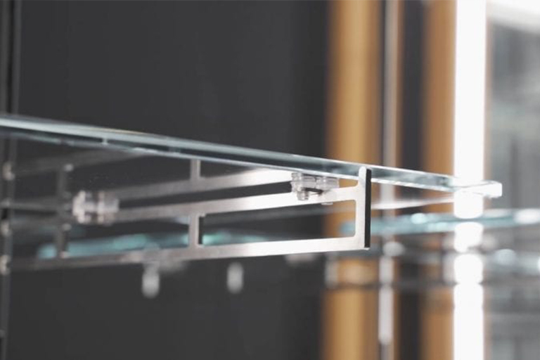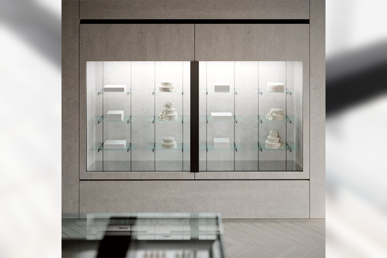(stoneware, acrylic, epoxy powder-coated steel, resin-coated steel, water-repellent wallpaper). Glass shelves can be adjusted on a rack rod. The indirect lighting is vertical inserted on the door frame with 3000°K no-spot strip LED.